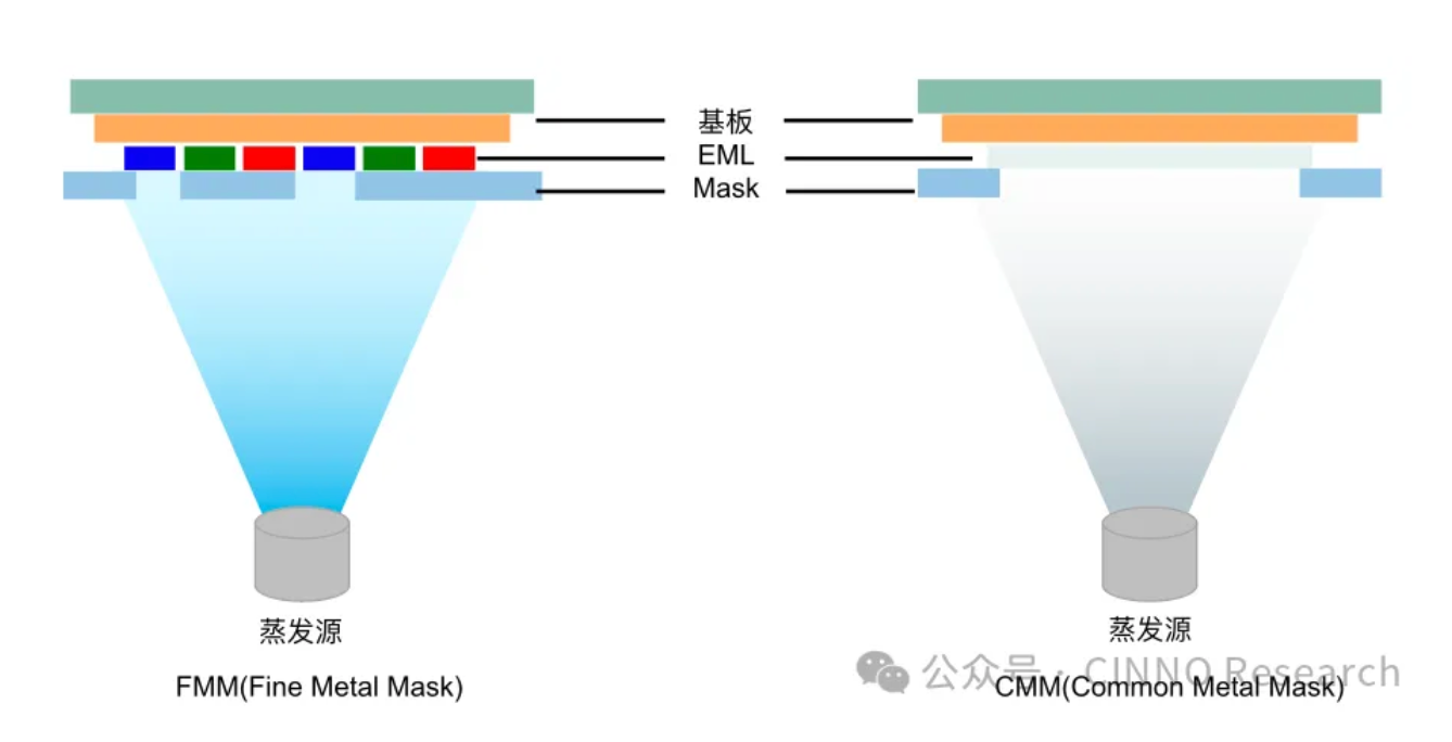 金属掩膜版是AMOLED蒸镀制程中的核心工具,在蒸镀工艺中覆盖于衬底上方,可以使得蒸镀材料沉积在基板上的指定区域。AMOLED蒸镀制程中所用到的金属掩膜版分为两类:一类是FMM(Fine Metal Mask,精密金属掩膜版),用于蒸镀红绿蓝子像素点的发光材料,因此要求其孔洞结构十分精细,FMM的结构精细程度直接决定了AMOLED面板的像素密度;另一类是CMM(Common Metal mask,通用金属掩膜版),或称为OPM(Open Mask,开放式掩膜版),主要用于蒸镀普通层结构,往往不需要按照像素的图形进行沉积,其孔洞尺寸基本上与面板产品尺寸相一致。