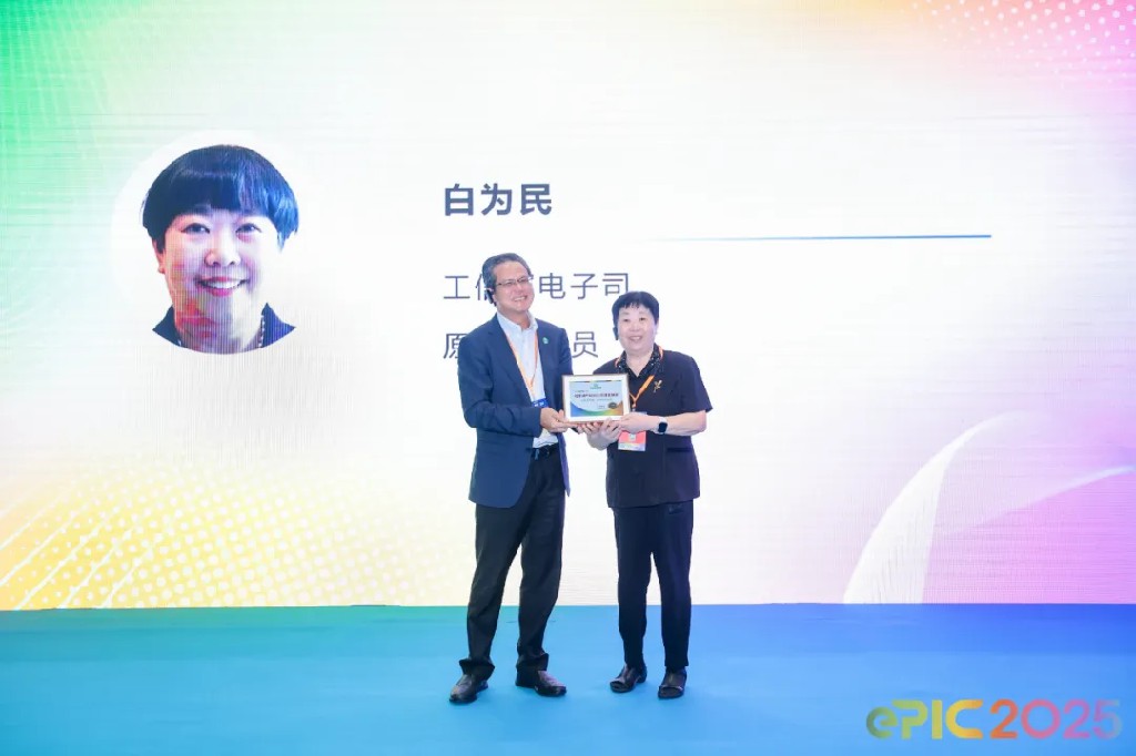 在白为民致辞结束后,大会进入重要的颁奖环节。白为民在职期间,为推动大陆液晶显示行业发展及两岸合作做出重要贡献;退休后仍活跃在显示产业一线,2025 年 1 月推动电子纸显示模组进口关税从 8% 降至暂定零关税,为本土企业每年节省近亿元关税。为表彰其卓越贡献,电子纸产业联盟常务理事会决议为其颁发 “2025 年度产业贡献奖”。颁奖仪式上,电子纸产业联盟执行理事长陈任桂为白为民颁奖,现场嘉宾共同见证了这一激动时刻。