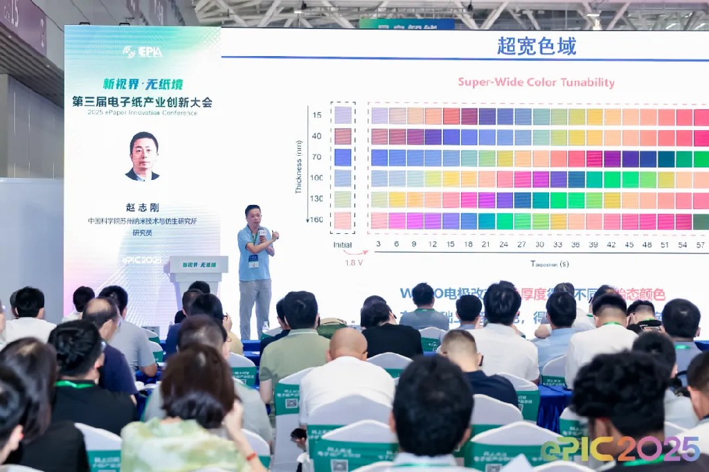 中国科学院苏州纳米技术与纳米仿生研究所研究员赵志刚带来《法布里 - 珀罗谐振腔型电致变色显示新技术》分享,展示了除主流电泳式电子纸外的新兴电子纸技术成果。