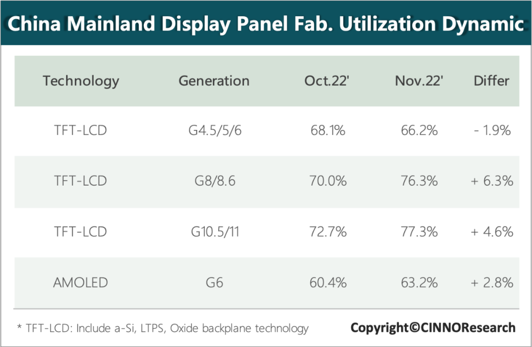 TCL 华星:11月TFT-LCD产线整体稼动率约72%,与10月相当。华星t1、t2两条G8.5产线11月投产数量增加,稼动率环比增长超过10个百分点,G10.5产线投产有所下调。华星AMOLED t4产线11月投产稼动率约50%。