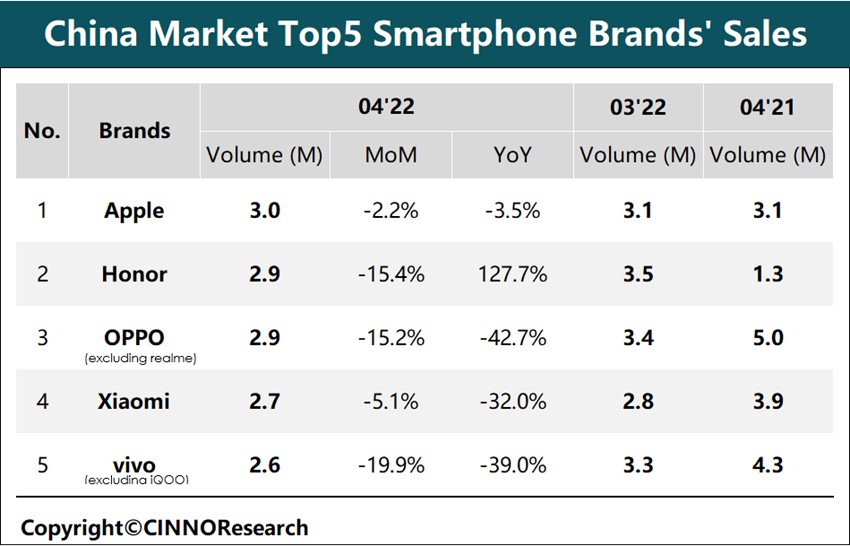 根据CINNO Research《月度中国智能手机市场销量分析报告》显示,2022年4月国内市场智能手机销量仅为1,760万部,较去年同期下滑21.6%,环比下滑12.2%,单月销量创下2020年疫情以来的第二差单月成绩,仅高于2020年2月水平,同时这是自2015年以来最差的4月历史销量,更加凸显了今年4月销量表现惨淡。