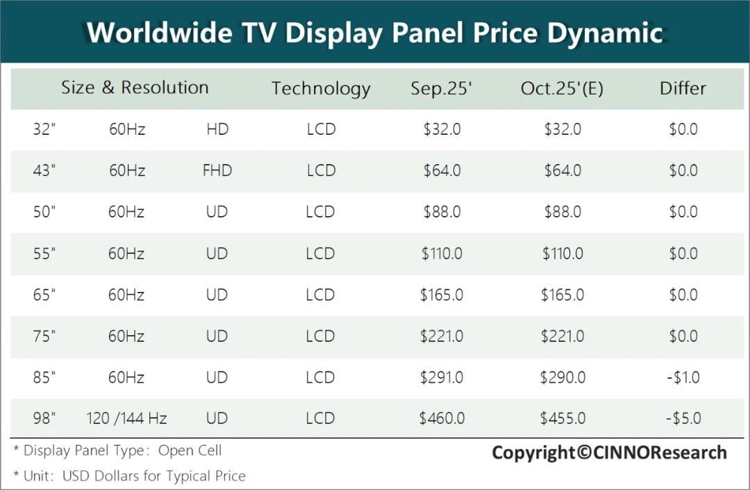 CINNO Research统计数据表明,今年10月面板整体需求维持稳定,预计绝大部分面板价格将趋于稳定,具体来看,32"至75"面板价格与9月相比基本持平,预计价格分别为:32美元、64美元、88美元、110美元、165美元和221美元,不过,85"和98"等超大尺寸因需求支撑不足,价格或将承压微跌,预计分别下跌2美元和5美元至290美元和455美元水平。展望后市,四季度面板价格走势后续将聚焦于面板厂的控产力度以及终端市场的消费能力。